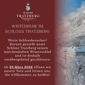 SCHLOSS TRATZBERG Schlossführungen Audioguide Räume Online-Tour Schlossgeschichte Tratzberg Express Rittershop Schlosswirt TICKETS Eintrittskarten kaufen Bus- & Reisegruppen ÖFFNUNGSZEITEN FEIERN & LOCATION Hochzeiten & Events Weinempfang Fotoshootings Kindergeburtstag Film-Location KONTAKT NEWS Bewertungen PRESSE FAQ English